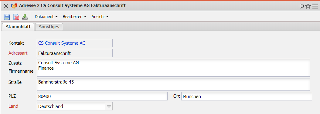 - Anschrift PLZ/Ort: In diesen Feldern werden die Postleitzahl und der Ort für die Adresse eingegeben.