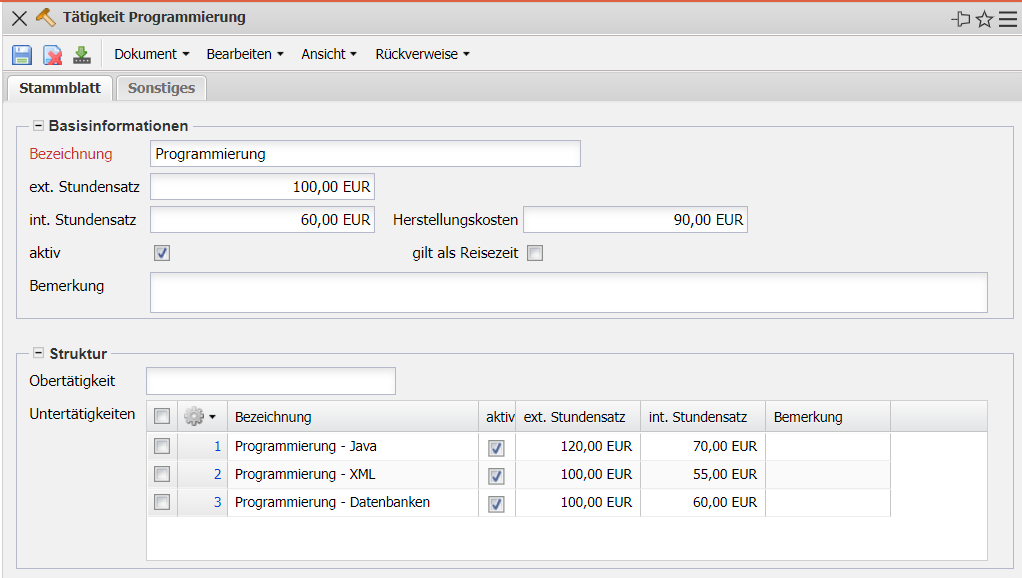 Die Maske Tätigkeit verwaltet alle Tätigkeiten für die Projektabwicklung. Jeder definierten Tätigkeit kann ein externer und zwei interne Tätigkeitssätze (auf Basis von Stunden) zugeordnet werden. Die Berechnungssätze werden für die Kalkulation, Angebots- und Rechnungsstellung herangezogen. Die Verrechnungssätze und Herstellungskosten werden für interne Projekte und die Ermittlung der tatsächlichen Projektkosten benötigt. Diese Tätigkeiten bilden die Basis für die Kosten- und Preisfindung und darüber hinaus bilden sie die Grundlage für das Vorschlagswesen (siehe auch Arbeitspakete und Mitarbeiterauswertung). Die Tätigkeiten können in Ober- und Untertätigkeiten gegliedert werden.