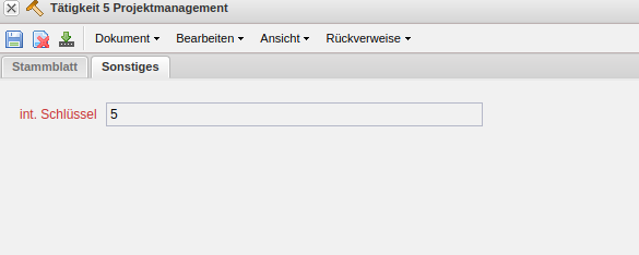 - Obertätigkeit: Das Feld Obertätigkeit charakterisiert die Existenz einer übergeordneten Tätigkeit. Ist das Auswahlmenü leer, dann ist die Tätigkeit nicht weiter untergliedert; also selbst eine übergeordnete Tätigkeit. Im Beispiel ist dieses Feld leer, da diese Tätigkeit selber die Ober-Tätigkeit ist.