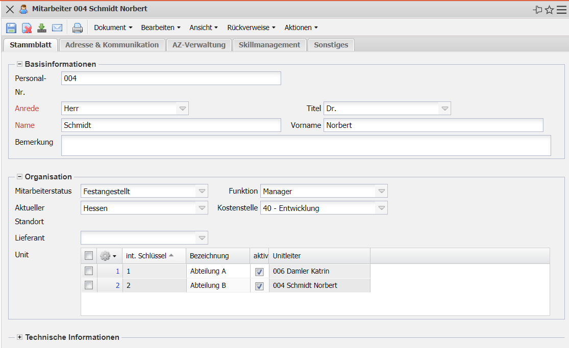 - int. Schlüssel: Dieses alphanumerische Feld kennzeichnet den Mitarbeiter eindeutig im System.