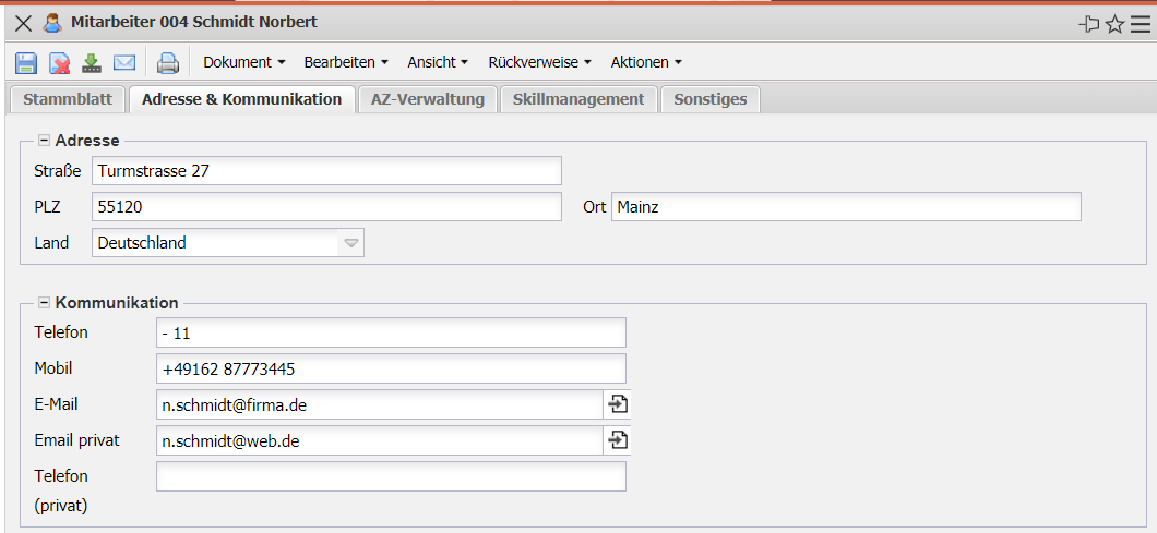 - Straße, Plz, Ort und Land: Diese Felder kennzeichnen die vollständige Adresse des Mitarbeiters. Das Land kann in den Collections definiert und geändert werden.