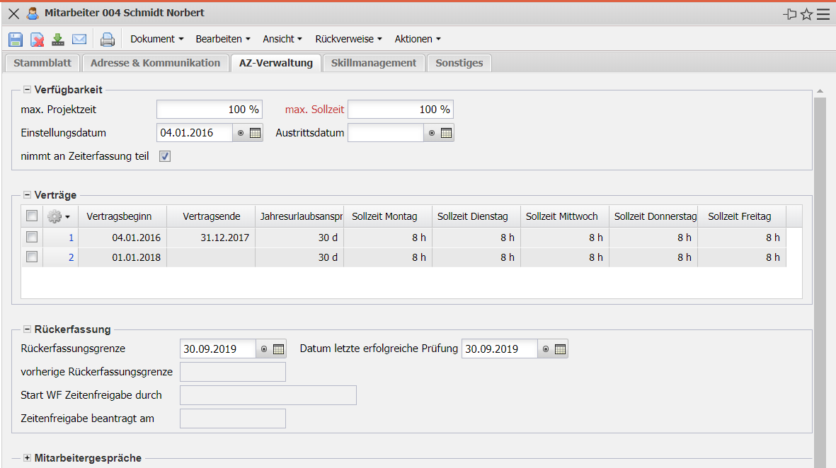 - Verträge: In dieser Mehrfachauswahl werden die Verträge für die Mitarbeiter festgelegt. Verträge können über einen bestimmten Zeitraum definiert werden (siehe auch Arbeitszeitverwaltung).