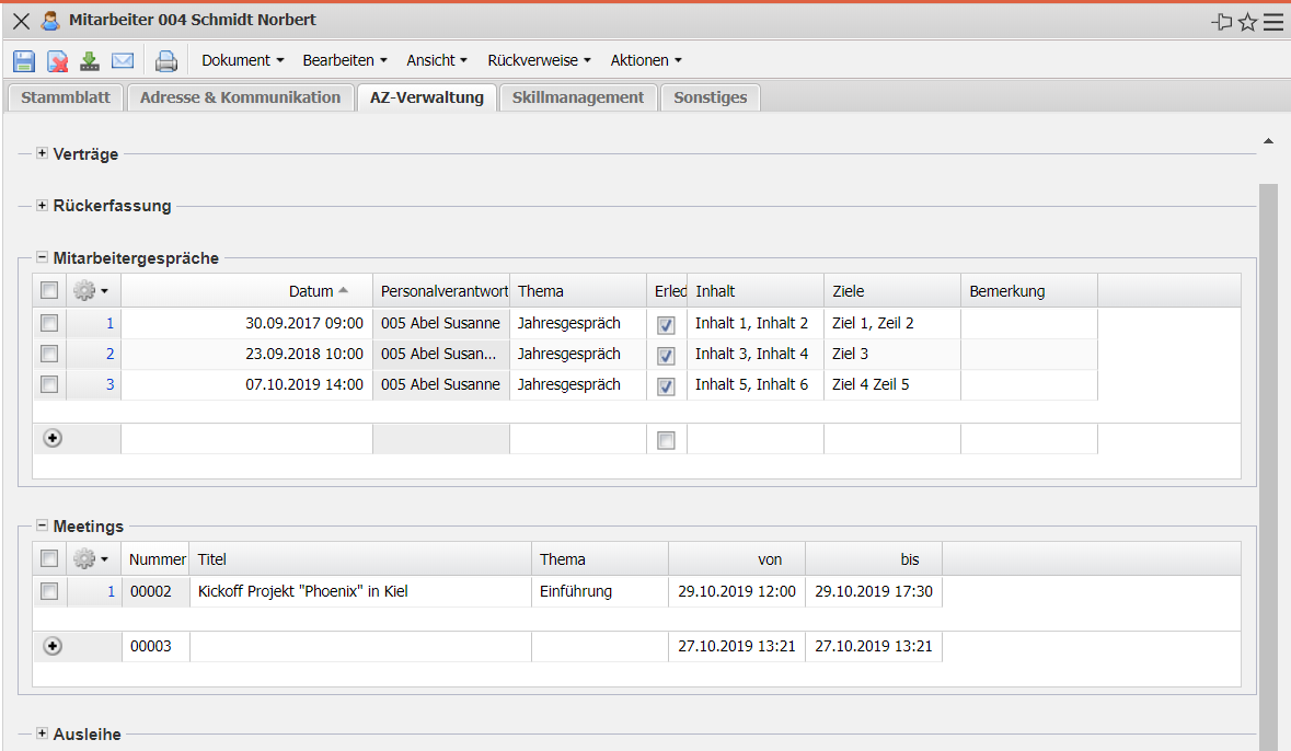 - Ausleihe: Hier können Ausleihen von Betriebsmitteln (Smartphones, Firmenfahrzeuge, Notebooks, …) verwaltet werden (nicht Standard).
