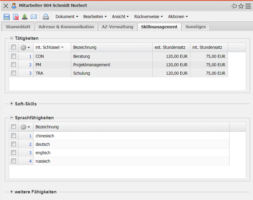 - Soft-Skills, Sprachfähigkeiten: Diese Felder ermöglichen die Zuordnung von weiteren Fähigkeiten des Mitarbeiters.
