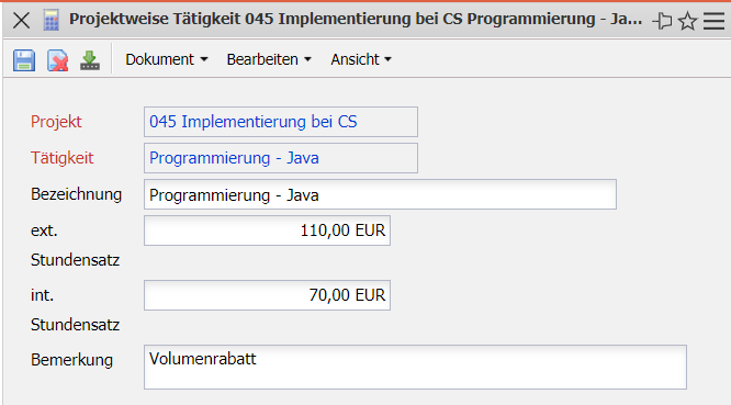 • Externer Stundensatz: Hier wird der Berechnungssatz der Tätigkeit festgelegt. Dies wird dann dem Kunden für dieses Projekt in Rechnung gestellt.