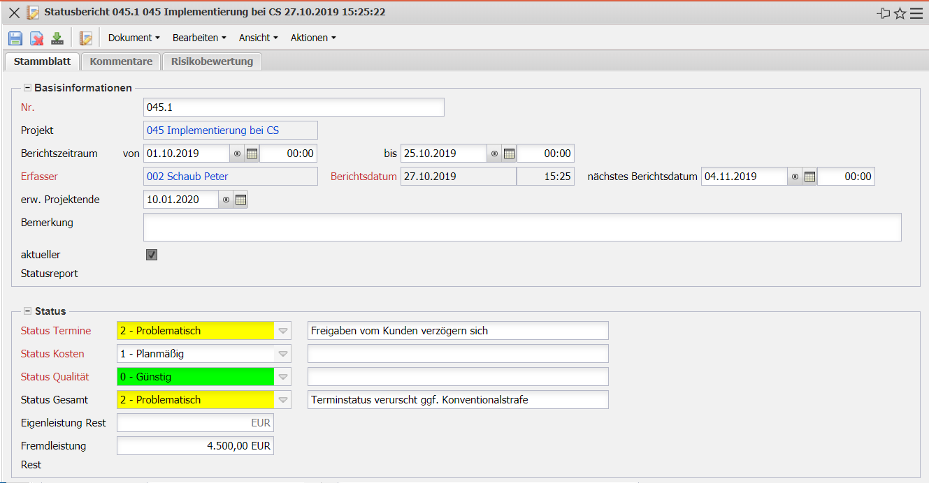 • Erfasser: In diesem Feld wird der Mitarbeiter angezeigt, der den Statusbericht angelegt hat.