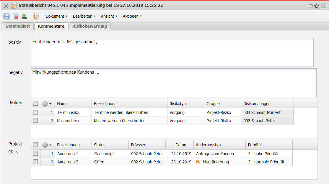 • Projekt-CRs: Hier können in Textform dem Projekt zugehörige Änderungsanträge hinterlegt werden.