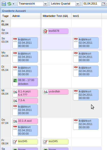In der Teamansicht wird jeder Eintrag mit seinem vollen Text angezeigt. Einträge die an mehr als einem Tag sind werden für jeden betreffenden Tag separat angezeigt.