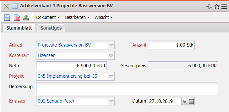Die Maske Fremdkosten ermöglicht die projektbezogene Abrechnung/Weiterbelastung von Fremdleistungen bzw. Artikeln. Die Anzahl der im Modul Stammdaten definierten Fremdleistungen (beispielsweise Artikel oder Lizenzen) werden einem Projekt zugewiesen. Der Verkaufspreis wird dabei mit dem empfohlenen Verkaufspreis des Artikels vorbelegt und der entsprechende Gesamtpreis angezeigt.
