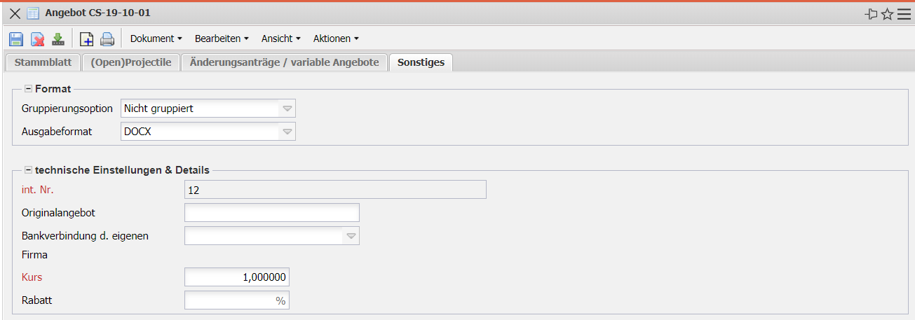 - int. Nr.: In diesem Feld wird die Nummer (INT) des Angebots automatisch vom System hinterlegt.