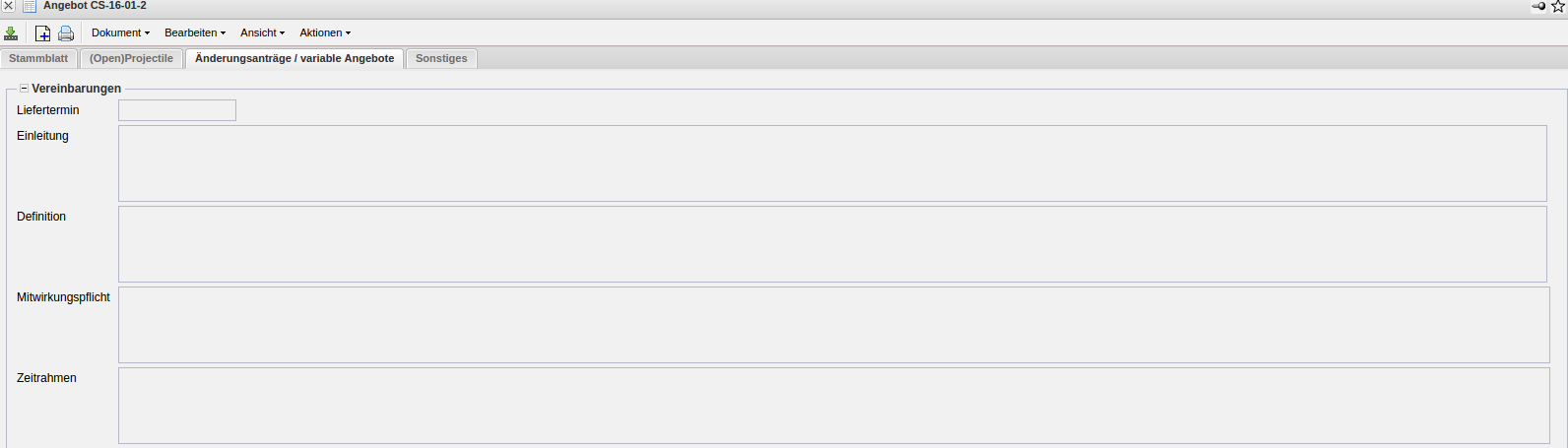 Die Maske Angebot realisiert die Angebotserstellung für ein ausgewähltes Projekt oder Unterprojekt. Ein Angebot kann nur für externe Projekte erstellt werden. Diese Maske beinhaltet die Informationen zum Angebotsbetrag, dem Ersteller des Angebotes, das Angebotsdatum und die zugehörigen Angebotspositionen.