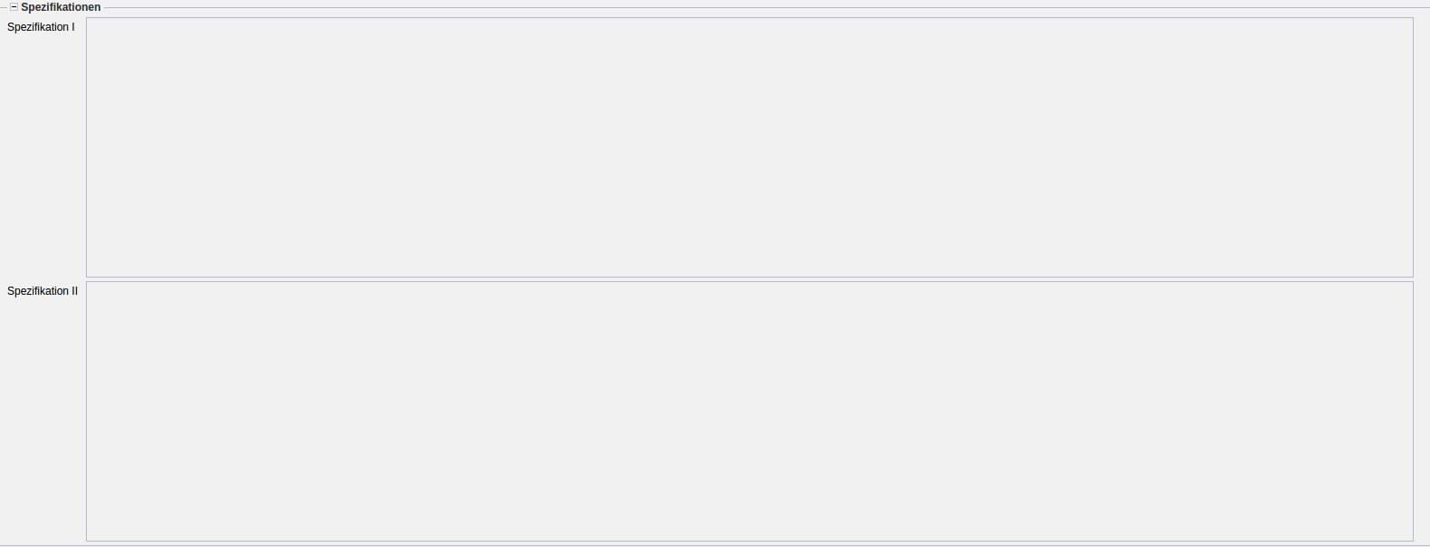 - Spezifikation I/II: Diese Felder zeigen die Spezifikationen an.