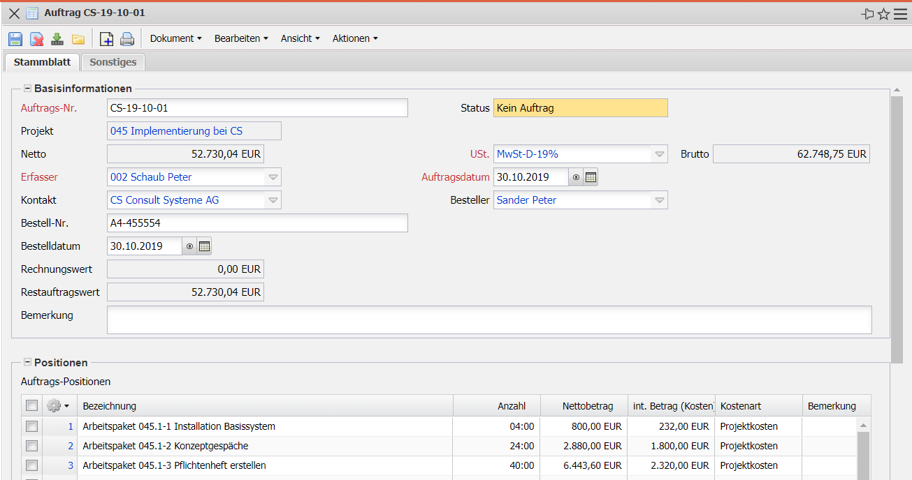 - Auftragspositionen: Hier werden die Auftragspositionen aufgelistet.