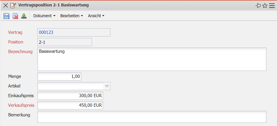 - Bezeichnung: Dieses Feld kennzeichnet die Bezeichnung der Vertragsposition.