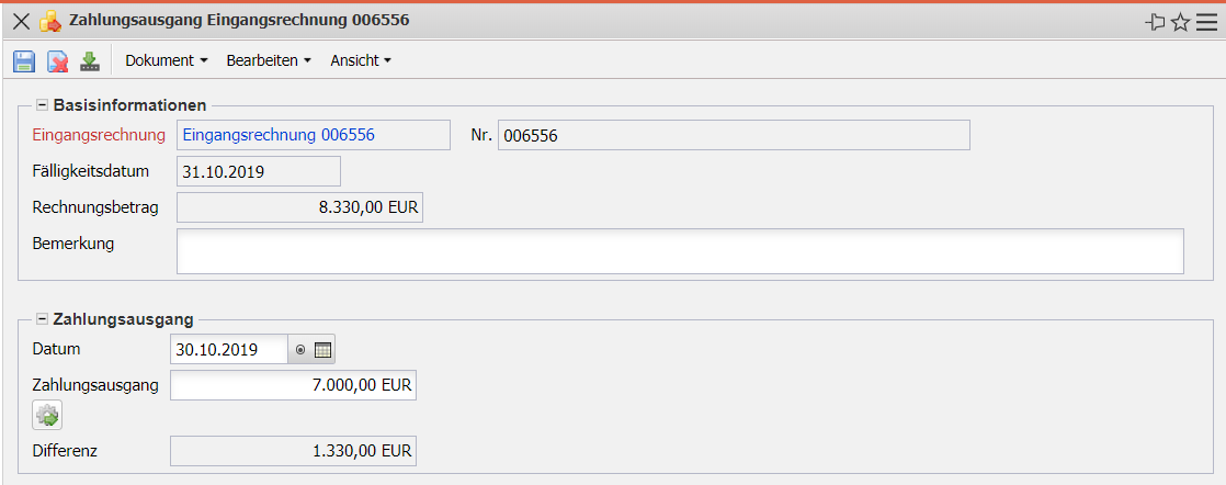 Die Maske Zahlungsausgang verwaltet die Zahlungsflüsse im Bezug auf die Fremdrechnungen (Eingangsrechnungen). Die Zahlungsausgänge beinhalten Informationen über Rechnungsbetrag, Datum und Betrag des Zahlungsausganges. Darüber hinaus wird die Differenz zwischen der Rechnungssumme und dem Betrag des Zahlungsausgangs ausgewiesen.