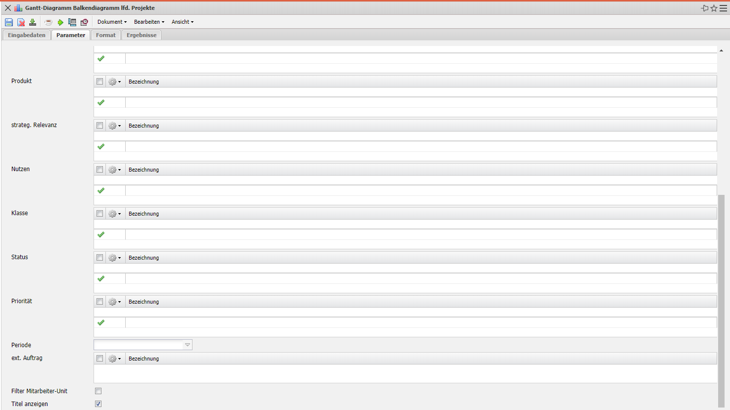 • Produkt, Strategie, Nutzen, Klasse: In diesen Auswahlboxen können als Selektionskritierium Produkt, Strategie, Nutzen und Klasse gewählt werden. Diese Selektionen beziehen sich jeweils auf die gleichnamigen Felder im Projekt.