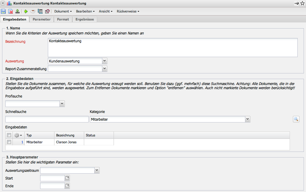 - Auswertung: Die Kontakteauswertung beinhaltet die Kundenauswertung.