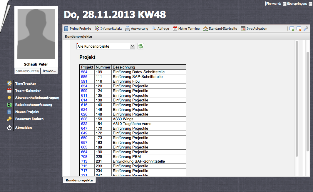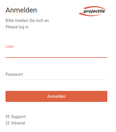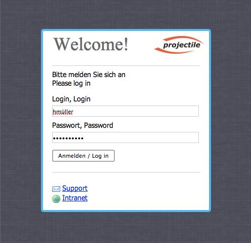 Damit sich ein Benutzer im System anmelden kann, ist es notwendig, diesen Benutzer als Mitarbeiter zu definieren. Nach dem Start der Anwendung (Bookmark im Browser oder Eingabe der URL) erscheint zunächst der Login-Bildschirm. Die Startadresse hat in der Regel folgenden Aufbau: http://projectile-server/projectile/start.