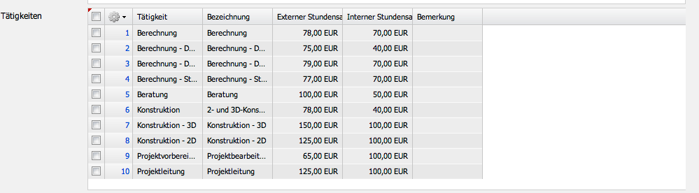 … mit allen definierten Tätigkeiten im System.