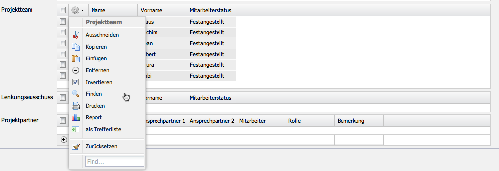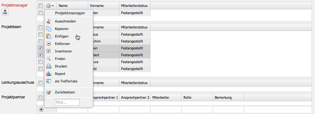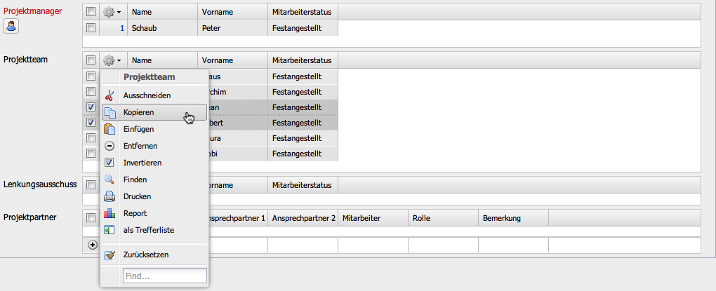 Im folgenden Beispiel sollen zwei Mitarbeiter aus dem Projektteam zum Projektmanager “befördert” werden. Dazu werden die Teammitglieder zunächst markiert, dann kopiert und …
