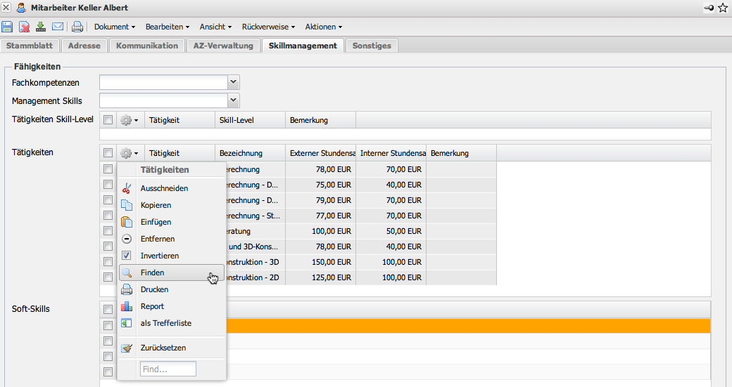 Im Mitarbeiter öffnet sich durch Klicken auf das Fernglas im Feld Tätigkeiten ein Dialog …