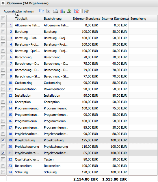 Durch die Auswahl der Tätigkeiten und Betätigen des Buttons “Auswählen und zurück”, werden die markierten Tätigkeiten …