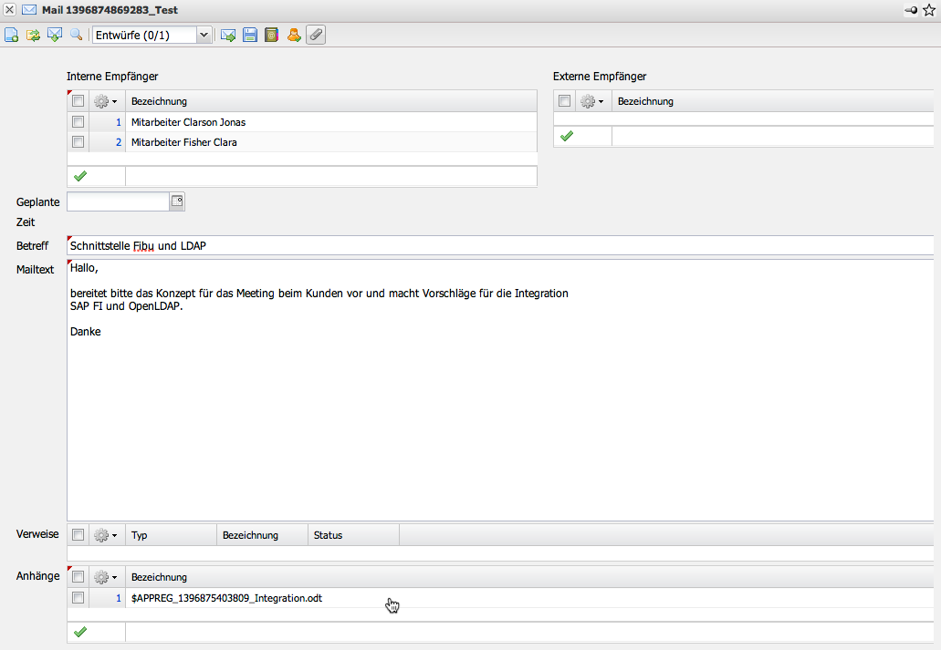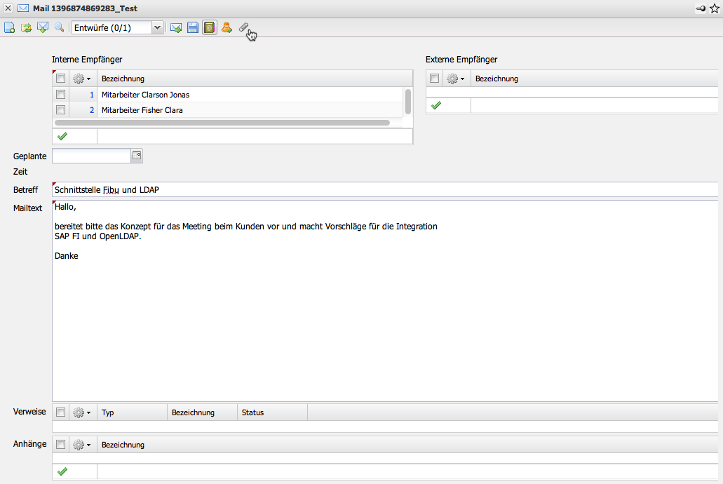 … und sie wird automatisch der Mail als Anhang zugefügt. Auch Verweise können in die Mail eingefügt werden. Diese Verweise können beliebige Projectile-Dokumente sein und werden mit Hilfe der Suchmaschine ausgewählt.