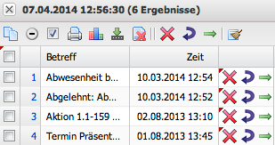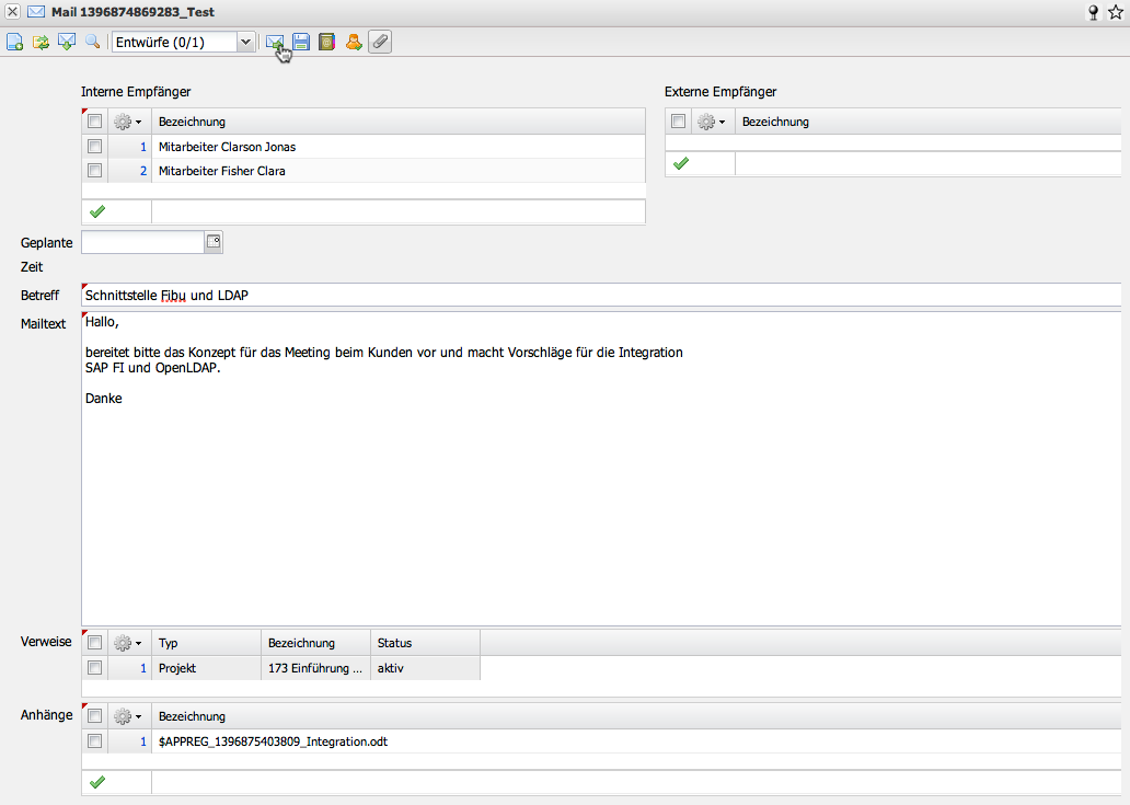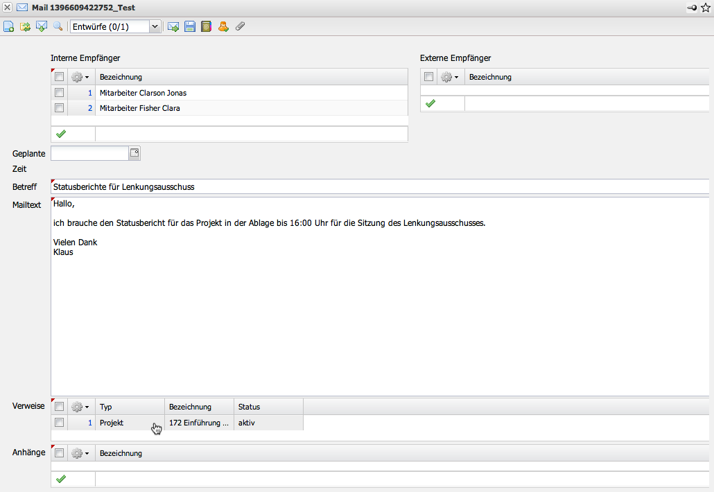 Interne Mails können, neben der eigentlichen Nachricht, auch beliebige und beliebig viele Projectile-Masken beinhalten. Diese Maske werden als Verweise in den Mails angelegt und können vom Empfänger der Nachricht (wenn eine entsprechende Berechtigung vorhanden ist) direkt geöffnet werden. Im Beispiel enthält die Nachricht zwei Verweise auf Projekte, die der Empfänger …