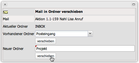Diese Funktionalität öffnet einen Dialog, wo entweder ein bestehender Ordner ausgewählt werden kann, oder ein neuer Ordner angelegt wird. Im Beispiel wird mit “Verschieben” ein neuer Ordner mit dem Namen “ Projekte” angelegt …
