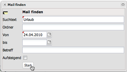 … im Betreff oder Text den String “Urlaub” enthalten und seit 24.04.2010 in beliebigen Mailordnern enthalten sind …