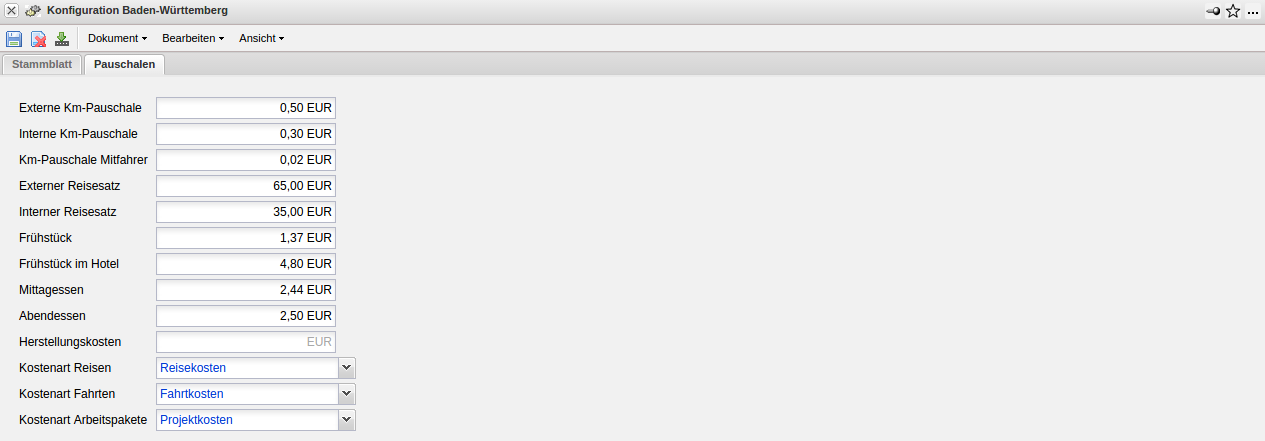 Im Dokumenttyp Konfiguration werden die globalen Parameter für die firmenweiten Einstellungen definiert. Dazu gehören Standort der Projectile-Version, das Land der Firma, die Sprache und die Haus- und Zweitwährung der Firma, die km-Pauschalen für Dienstfahrten und Reisetätigkeitssätze, Zahlungsziel, Eckwerte für Mahlzeitenstellung (siehe auch Dokumenttyp Reise) und Zuschläge.