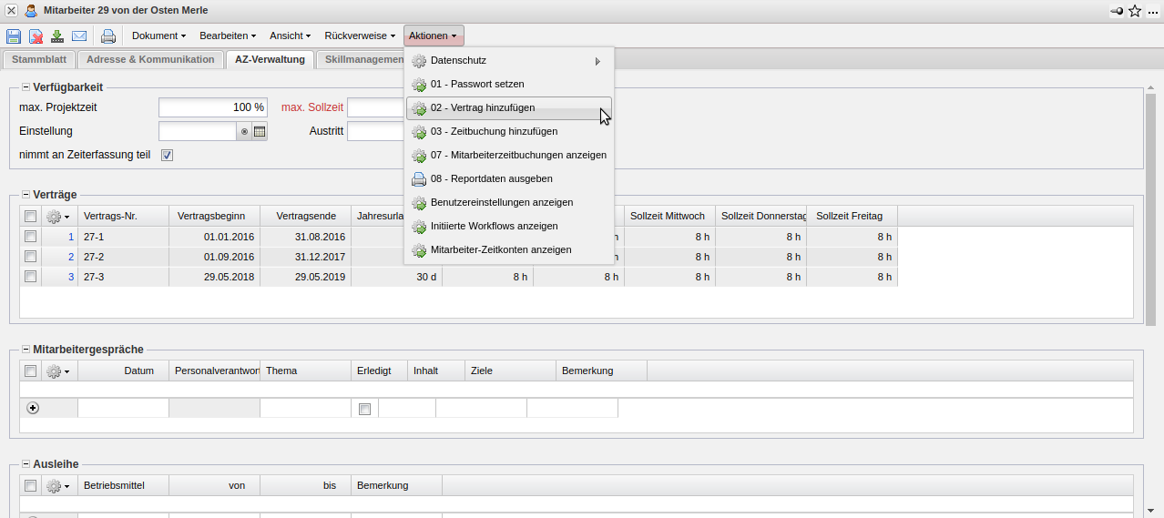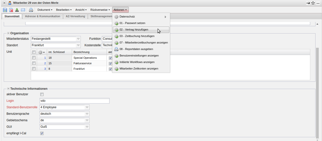 Im folgenden Beispiel wird für die Mitarbeiterin Merle von der Osten ein Vertrag angelegt. Mit Hilfe der Aktion “Vertrag hinzufügen” wird für ein neues Dokument vom Typ Mitarbeitervertrag geöffnet.