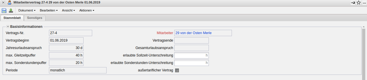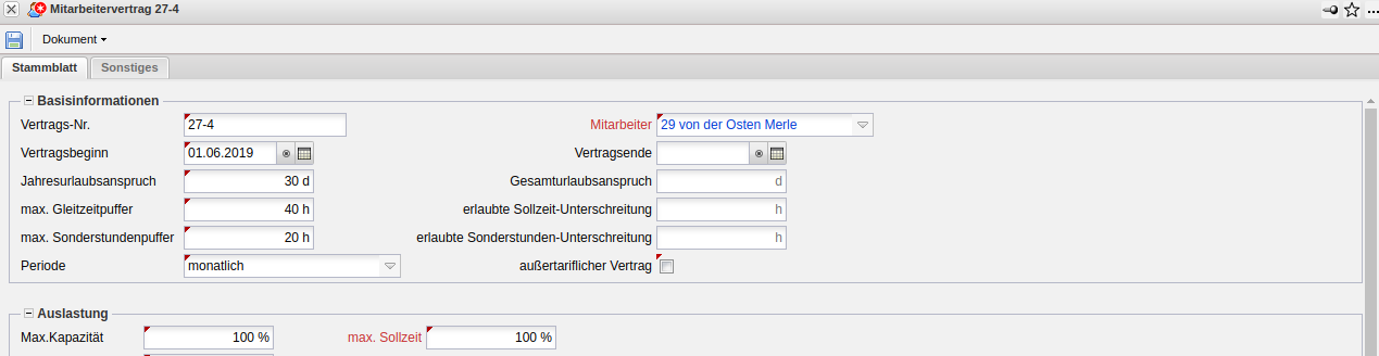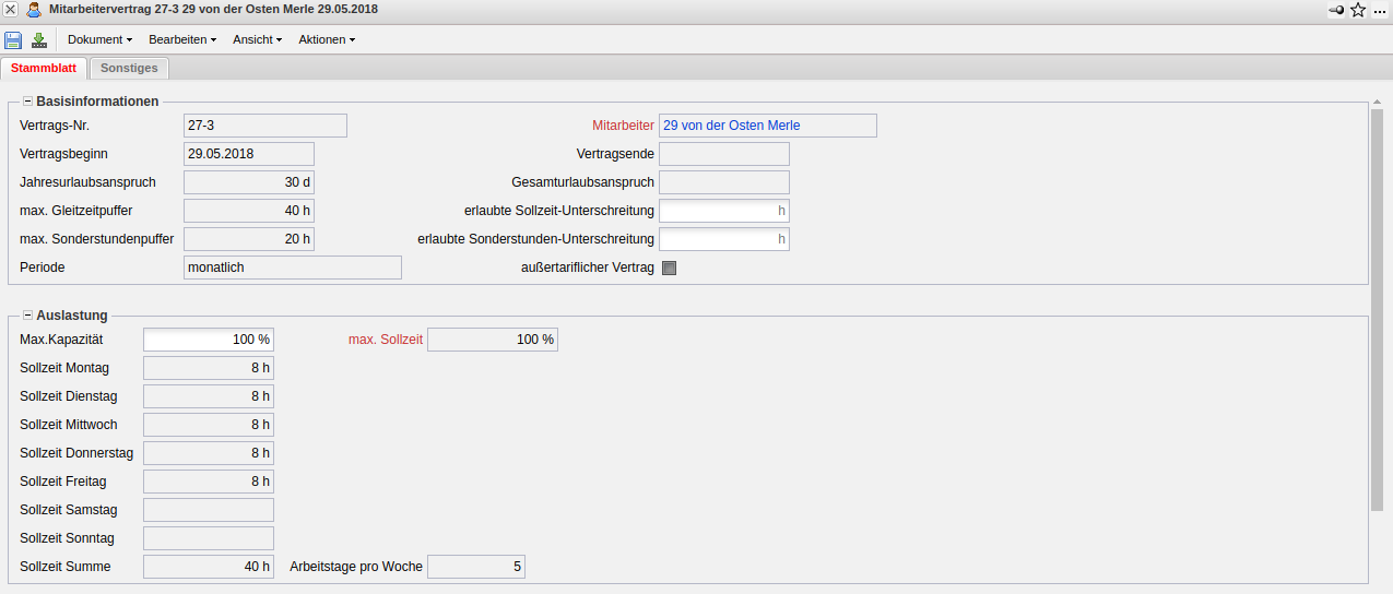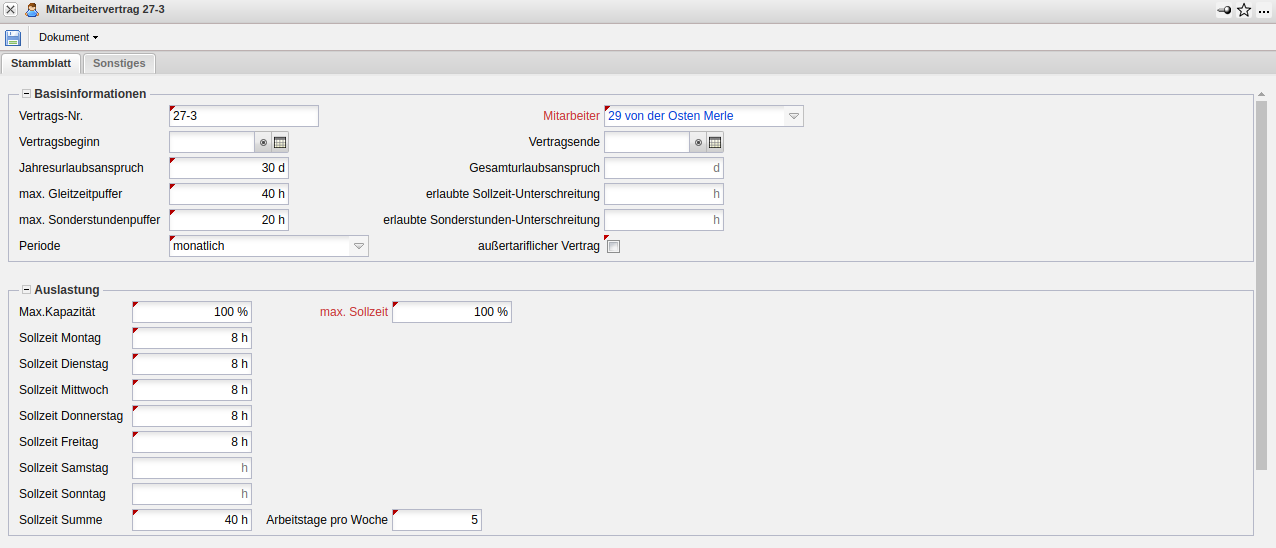 Im Vertrag werden einige Felder vom System vorbelegt (Mitarbeitervertragsnummer, Mitarbeiter, Jahresurlaubsanspruch, Maximaler Gleitzeitpuffer und Sonderstundenpuffer, Periode aus dem Kalender des zugeordneten Mitarbeiters und die Werte Maximale Arbeitszeit und Kapazität aus dem Mitarbeiterdokument) und die Sollzeit von Montag bis Sonntag. Jeder Vertrag hat eine Vertragslaufzeit. Der Vertragsbeginn ist dabei ein Mussfeld und das Vertragsende kann (bei unbefristeten Verträgen) zunächst leer bleiben. Projectile überprüft bei Vertragsänderungen die Vertragslaufzeiten und lässt Überschneidungen von Verträgen nicht zu.