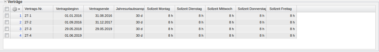 Nach Schließen des Vertrages sind im Mitarbeiterdokument beide Verträge ( und zwei ältere Verträge) verfügbar.