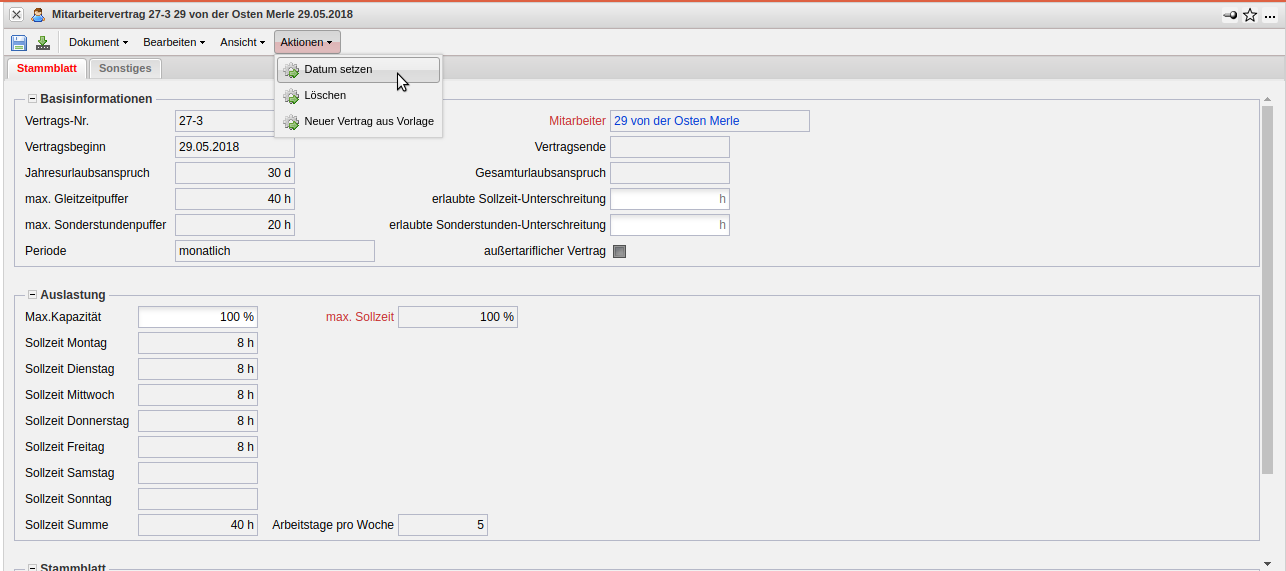 Pro Mitarbeiter können beliebig viele Verträge definiert werden. Die Verträge dürfen sich allerdings zeitlich nicht überlappen. Im folgenden Beispiel wird der erste Vertrag des Mitarbeiters auf den 29.05.2019 befristet. Nach Betätigung der Aktion “Datum setzen” …