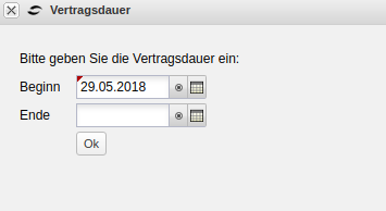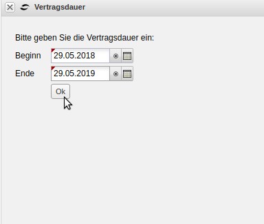 … öffnet sich ein Dialog, der die Änderung der Vertragslaufzeit ermöglicht. Nach Abänderung der Vertragslaufzeit (hier wird das Ende auf den …