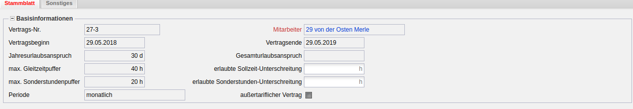 Im Beispiel ist für die Mitarbeiterin Von der Osten ein unbefristeter Vertrag (gültig vom 29.05.2018) definiert worden. Der Urlaubsanspruch pro Kalenderjahr beträgt für den Mitarbeiter 30 Tage. Darüber hinaus sind hier die Gleitzeit- und Sonderstundenintervalle mit zugehöriger Periode definiert. Der Mitarbeiter darf pro Monat maximal 40 Überstunden und 20 Sonderstunden erfassen ansammeln. Weitere Informationen in den Verträgen sind die verfügbare Arbeitszeit und Einplanbarkeit der Mitarbeiter (Max. Arbeitszeit = 100 % entspricht beispielsweise einer Vollzeitstelle und 75% einer ¾-Stelle). Weitere Informationen betreffen die Gehälter und die Kennzeichnung AT (außertariflich).
