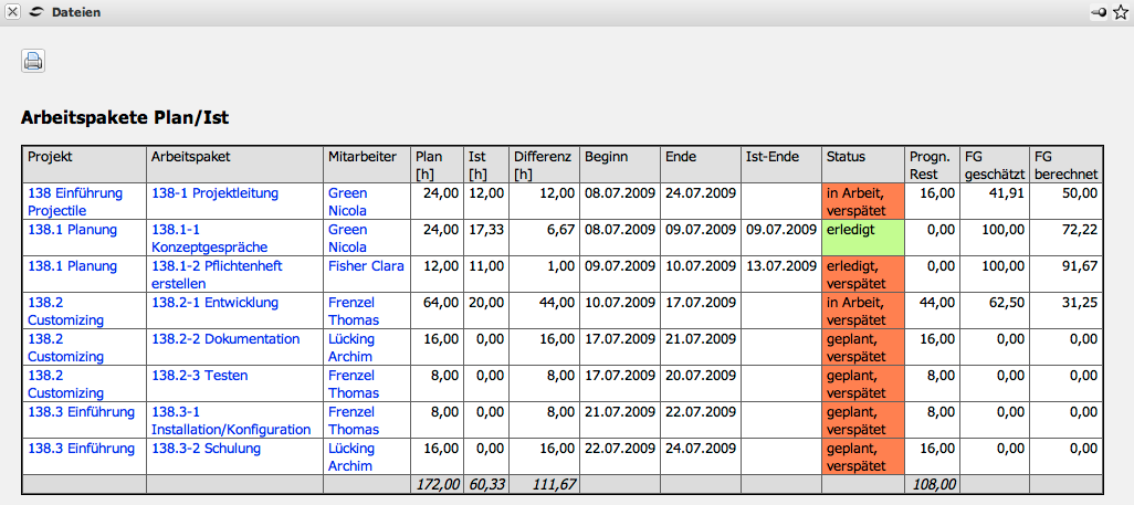 Die Auswertung Projekte Plan/Ist liefert eine Übersicht über die Arbeitsleistungen der einzelnen Projekte inklusive der dazugehörigen Unterprojekte. Die Plan- und Ist-Zeiten für die Projekte werden als Diagramm und in Form einer Liste dargestellt. Dabei werden die Plandaten direkt über die Zuordnung der Arbeitspakete zum Projekt oder Unterprojekt bestimmt und die Ist-Zeiten werden aus den Erfassungsdaten des TimeTrackers gewonnen. Die Auswertung beinhaltet darüber hinaus auch noch Informationen über Plan-Start und -Ende, über den Projektstatus und den geschätzten Fertigstellungsgrad.