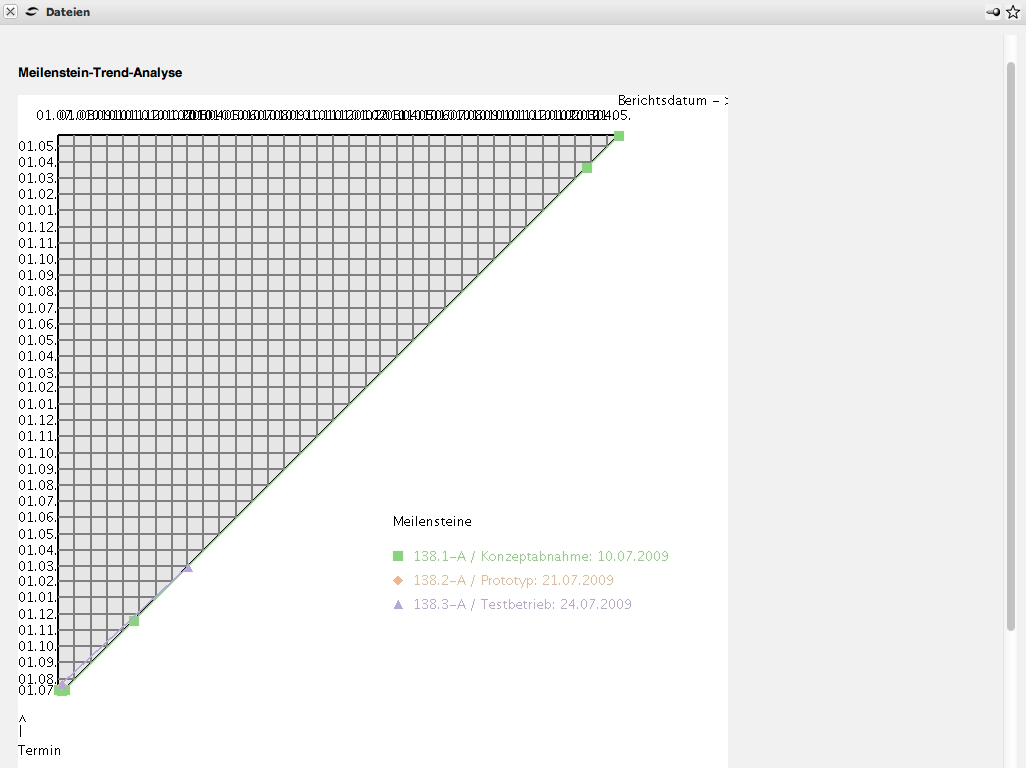 Die Auswertung Meilenstein-Trend-Analyse zeigt die Trends für die Erreichung der definierten Meilensteine an. Die Meilenstein-Trend-Analyse ist ein zukunftsbezogenes Instrument für die Terminkontrolle eines Projektes: An regelmäßigen Berichtszeitpunkten wird die Terminplanung des Projektes durch die Abfrage von Trenddaten der voraussichtlichen Zielerreichung neu geschätzt. Aus dem Kurvenverlauf läßt sich ein Trend über die Termintreue des Projektes ableiten. Die Trendtermine für die Meilensteine können im Dokumenttyp Trendtermin verwaltet werden.