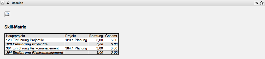 Die Projektauswertung realisiert die projektbezogenen Auswertungen. Dazu gehört die Projektübersicht, der Projektstrukturplan, Plan/Ist-Vergleiche für Projekte und Arbeitspakete, die Meilenstein-Trend-Analyse, die Visualisierung von Fertigstellungsgraden, Zeitnachweise und eine Skill-Matrix