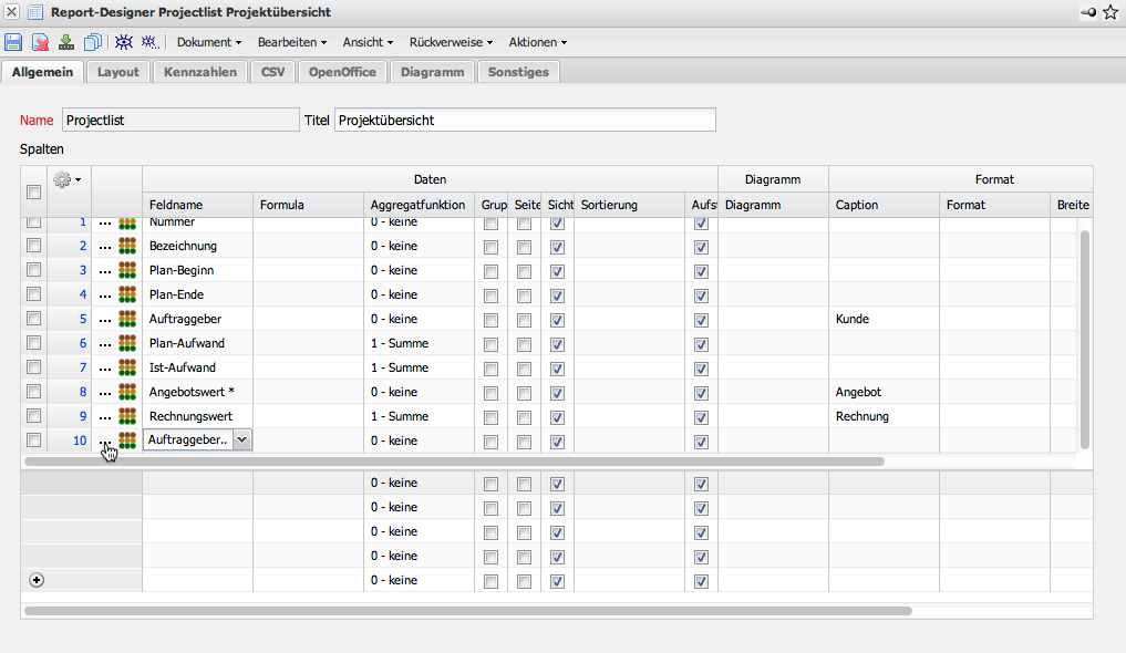 Im folgenden Beispiel werden die erweiterten Funktionalitäten des Designers anhand der “Projectlist” erläutert.