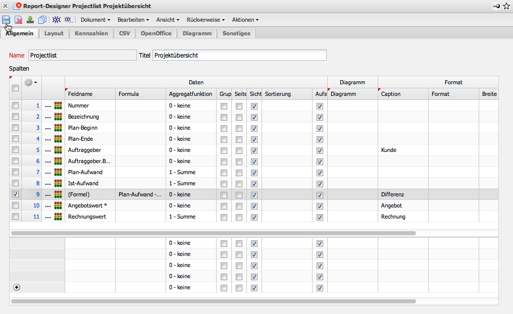 Innerhalb der Formel können alle Grundrechenarten (+,-,*,/) verwendet werden. Bei der Definition der Formeln muss aber stets auf die richtige Schreibweise (auch Groß-/Kleinschreibung) geachtet werden. Im Beispiel soll ein neues Feld mit dem Namen “Differenz” erzeugt werden, das aus den Feldern Plan-Aufwand - Ist-Aufwand berechnet und summiert werden soll (Aggregatsfunktion).