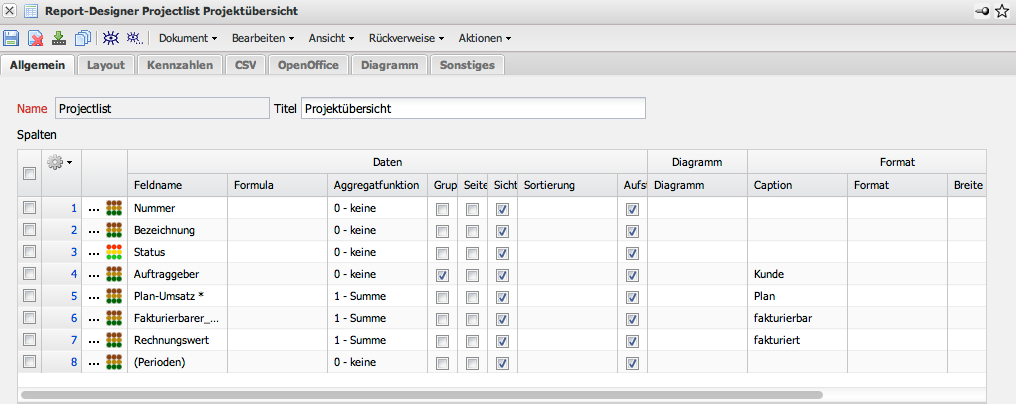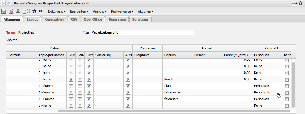 Im folgenden Beispiele werden in einer Projektübersicht Kennzahlen mit Abgrenzung verwendet. Für die Kennzahlen werden in der letzten Spalte die Eigenschaften der Perioden definiert. Im Beispiel werden die Kennzahlen periodisch abgegrenzt. Der Eintrag (Perioden) in Zeile 8 steuert die Verwendung periodischer Kennzahlen.