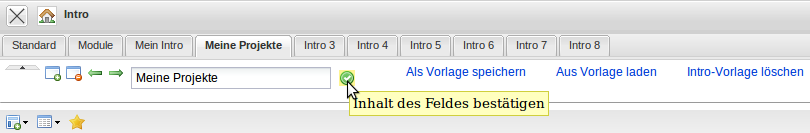 Anschließend können hier Einstellungen getätigt werden. Oberhalb der ausgewählten Tabelle lassen sich Name und Position des Reiters festlegen. Ein Klick auf den grünen Haken bestätigt die Einstellungen. Durch “Zuklappen” der Konfigurationsansicht wird in die geänderte Ansicht gewechselt. Im folgenden Beispiel wird der Reiter “Intro 2” …