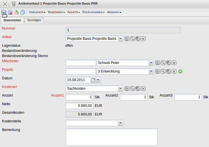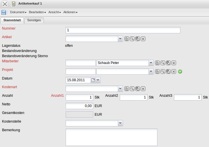 Das Dokument Artikelverkauf ermöglicht die Zuweisung der definierten Stammdaten aus den Fremdleistungen bzw. Artikeln zum Projekt.