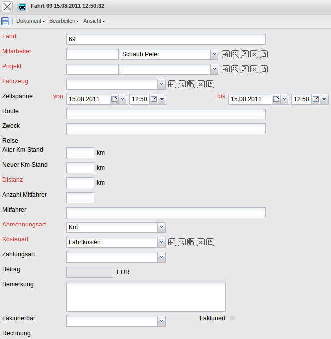 Das Dokument Fahrt ermöglicht die Erfassung von projektbezogenen Fahrten und deren Kosten, die der Projektmitarbeiter für das Projekt verursacht hat.
