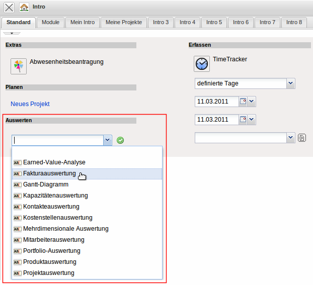Die Fakturaauswertung erzeugt die finanziellen Auswertungen im System. Dazu gehören u.a. die Kostenauswertungen (Plan/Ist-Vergleiche, also Budgets zu Kosten sowie die Detailauswertung), die allgemeinen Fakturaauswertungen Angebote, Budgets, Rechnungen, Kosten, Zahlungsflüsse und Deckungsbeitrag inklusive Detailauswertung), Übersichten über fakturierbare und fakturierte Leistungen, eine Auflistung der offenen Posten und die Ergebnisauswertung.