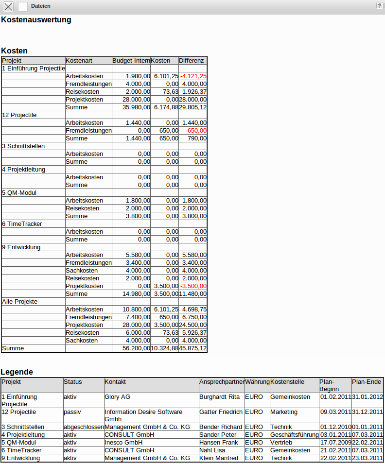 Fakturadaten: Hier werden die Angebotswerte (Extern Netto/Extern Brutto) und der interne Angebotswert Angebot basiert auf diesen internen Kosten), die internen und externen Budgets (aus den Arbeitspaketen und der Budgetverwaltung), die Rechnungsbeträge (Extern Netto/Extern Brutto) und der interne Rechnungswert (fakturierbare Leistungen) sowie die Zahlungseingänge und offene Forderungen aufgelistet. Kostendaten: Hier werden aus der Zeit- und Kostenerfassung die direkten Kosten (Reisekosten, Fahrtkosten, Belegkosten und Fremdkosten) und die Eingangsrechnungen inklusive Zahlungsausgänge und evtl. die offenen Verbindlichkeiten aufgeführt.