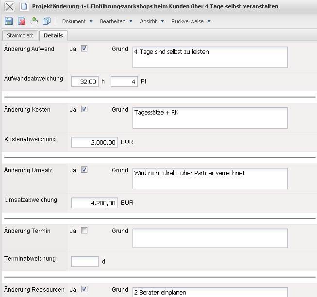 Auf dem zweiten Reiter, Details, kamm die Projektänderung weiter ausgeführt und detaillierter dargestellt werden. Es können Änderungen am Aufwand, den Kosten, dem Umsatz den Terminen, Ressourcen und Zielen mit Daten direkt erfasst werden.