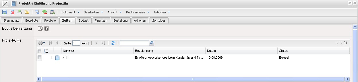 In dem Projekt, für das der Change Request erfasst werden soll, kann auf dem Reiter Zeiten eine neue Projektänderung über die Funktion “Neues Dokument” erfasst werden.